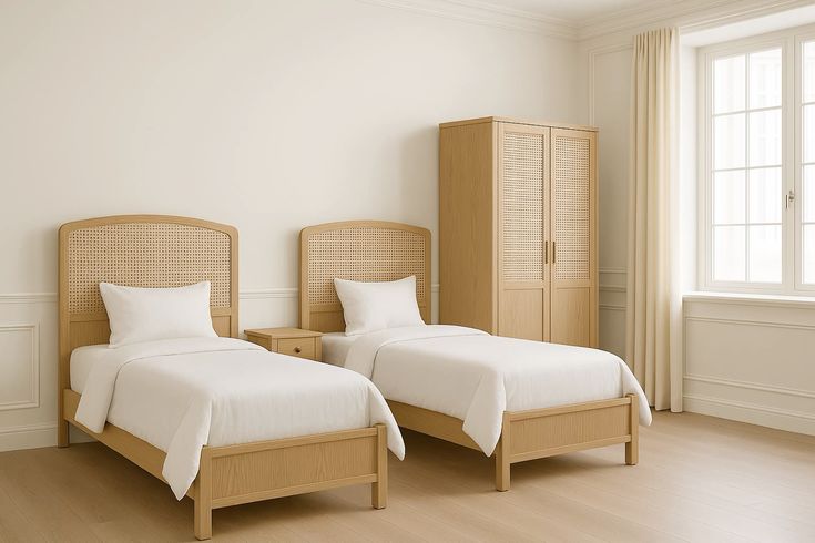الخامات : خشب زان + رتان + خشب كونتر فريست المقاسات:ال2سرير: عرض 100* طول 200* ارتفاع 115 الدولاب: عرض 100* عمق 50* ارتفاع 200 الكومود: عرض 50* عمق 40* ارتفاع 40 اللون : خشبي نفس لون الصورة