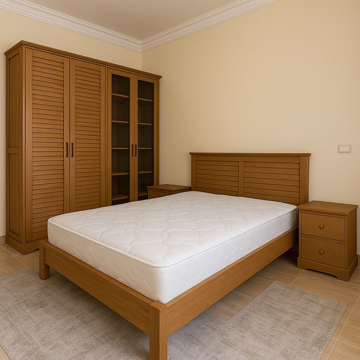 الخامات : خشب زان + خشب كونتر فريست المقاسات:السرير: عرض 160* طول 200* ارتفاع 115 الدولاب: عرض 180* عمق 50* ارتفاع 220 ال2كومود: عرض 50* عمق 40* ارتفاع40 اللون خشبي نفس لون الصورة