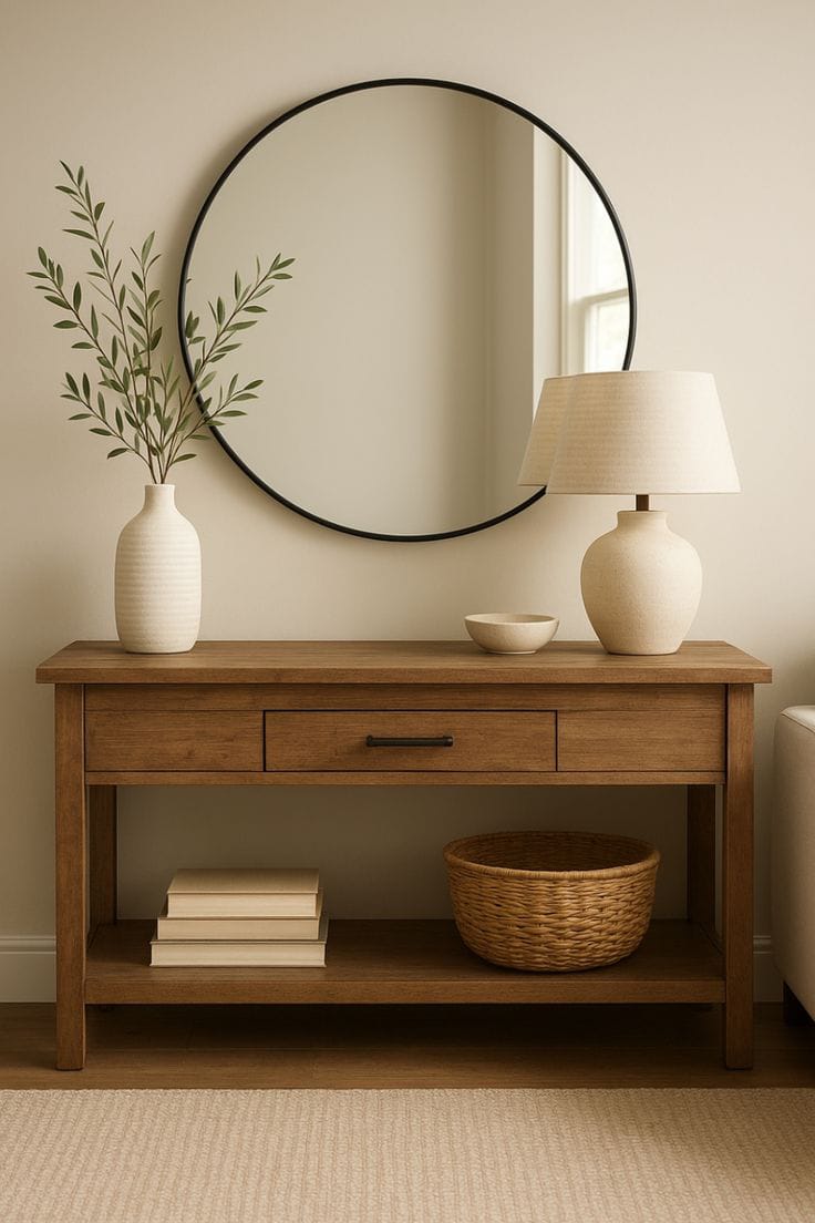 الخامات :خشب موسكي فلنديالمقاسات :العرض 110 سم العمق 38 سم الارتفاع80 سم المراية قطر 70 سم االلون : لون الصورة